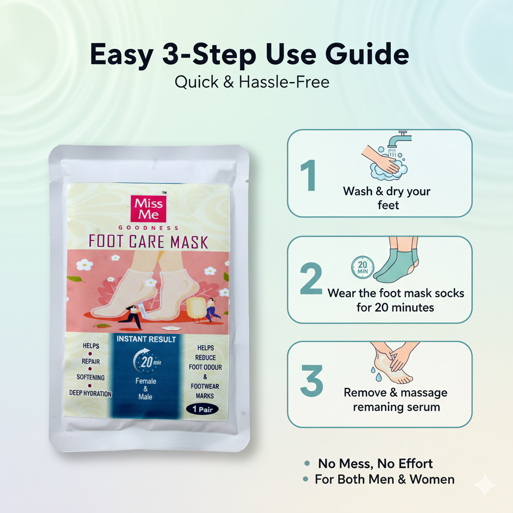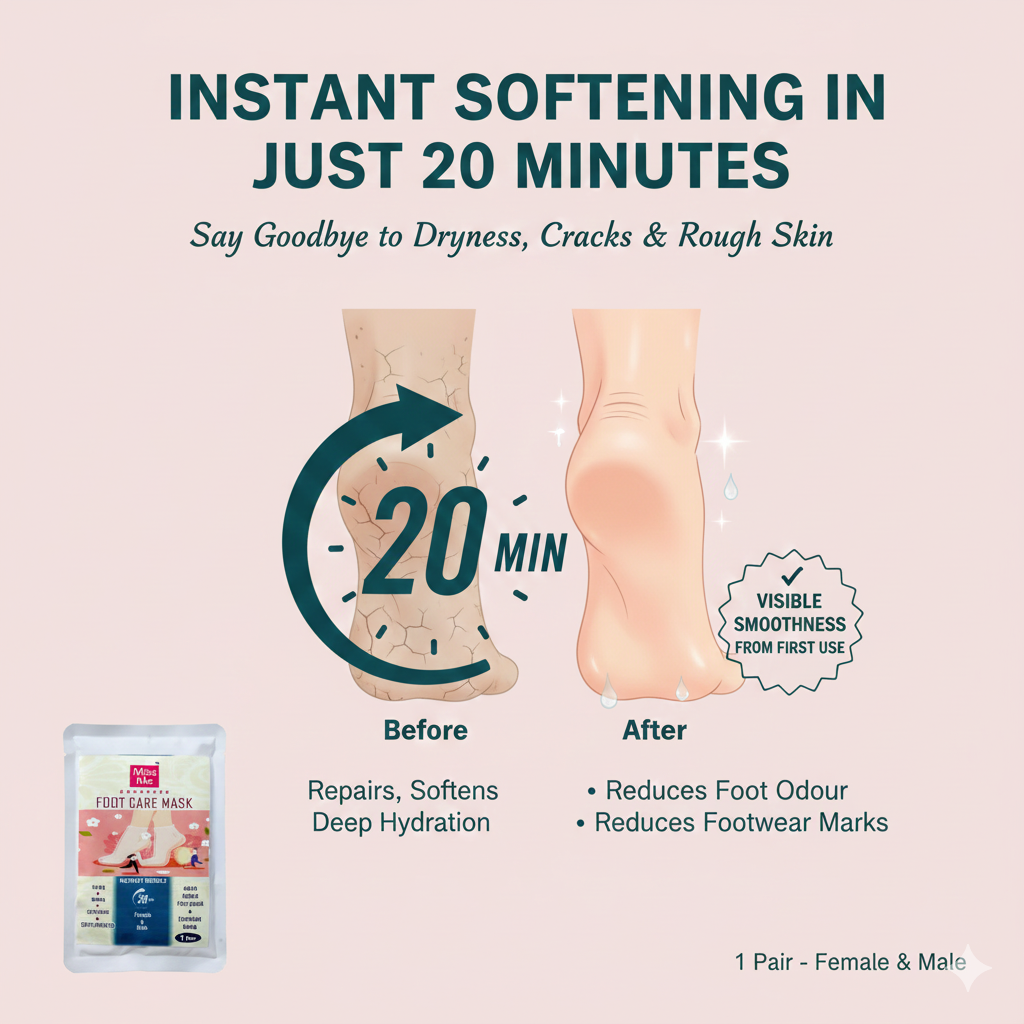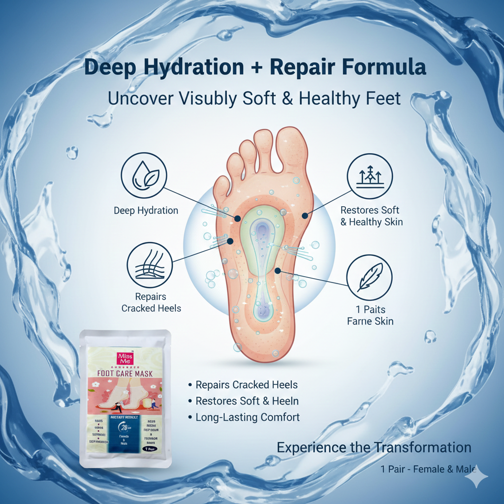 Miss Me Foot Care Mask is an intensive, deep-hydrating foot treatment designed to repair rough, dry, and cracked feet in just 20 minutes. Infused with nourishing ingredients, this easy-to-use foot mask softens hardened skin, delivers deep moisture, and restores smooth, healthy feet instantly.